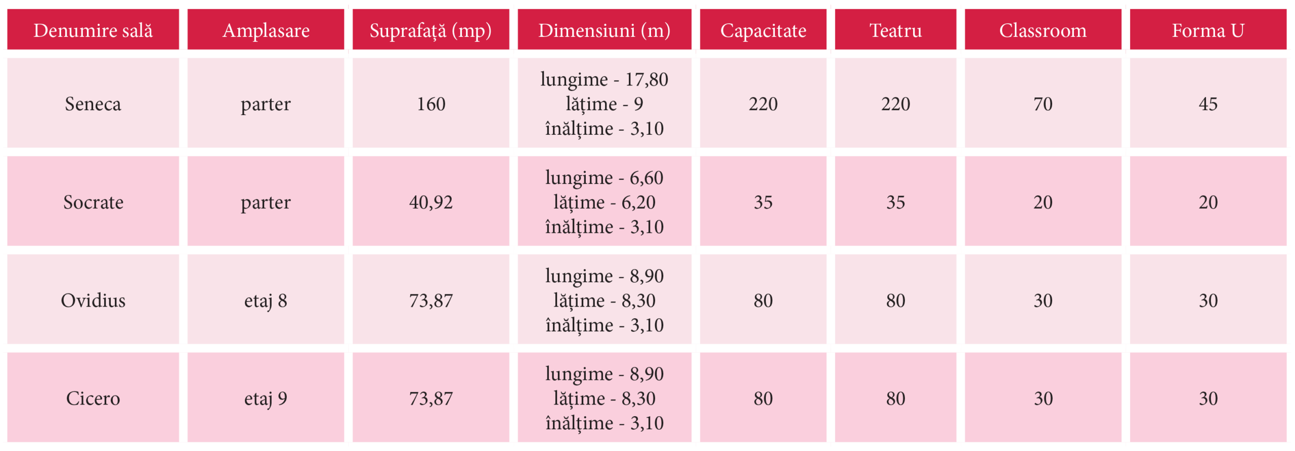 Sălile pot fi configurate în funcție de cerințele evenimentului, în aranjamente de tip teatru, sală de curs, formă U sau cabaret.